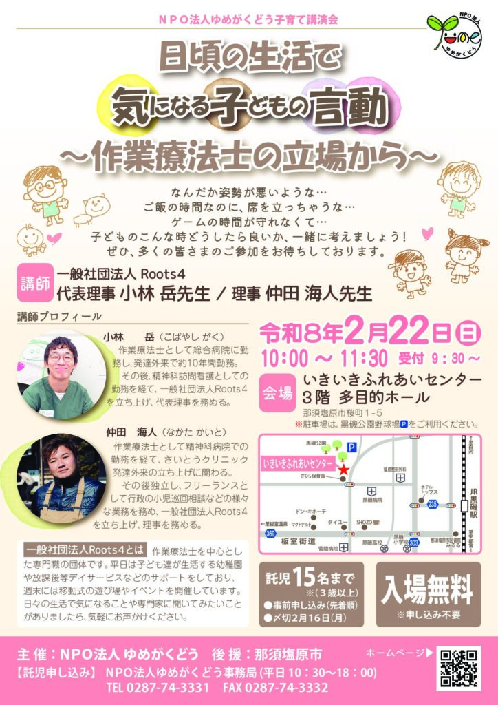 子育て講演会のご案内 2026年1月23日 最終更新日時 : 2026年1月26日 staff 令和8年2月22日㈰10:00~11:30いきいきふれあいセンター3階多目的ホールにて開催いたします。多くの方のご参加をお待ちしております。当日の参加も可能です。